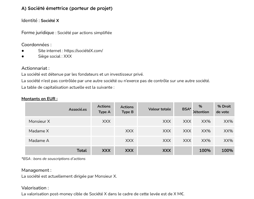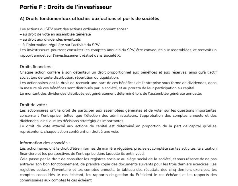 La partie E vous donne des informations précises sur le véhicule financier intermédiaire (aussi dit SPV). C’est un mécanisme d’investissement mis en place pour gérer les financements avec plus de facilité et de fluidité. Le SPV est une société intermédiaire, entre les investisseurs et le porteur de projet, créée spécifiquement pour la collecte. Au succès de cette dernière, le SPV reçoit l’ensemble des investissements et devient actionnaire minoritaire de la société émettrice du projet. Par exemple, chez We Take Part, la grande majorité des investissements sont réalisés via un SPV.